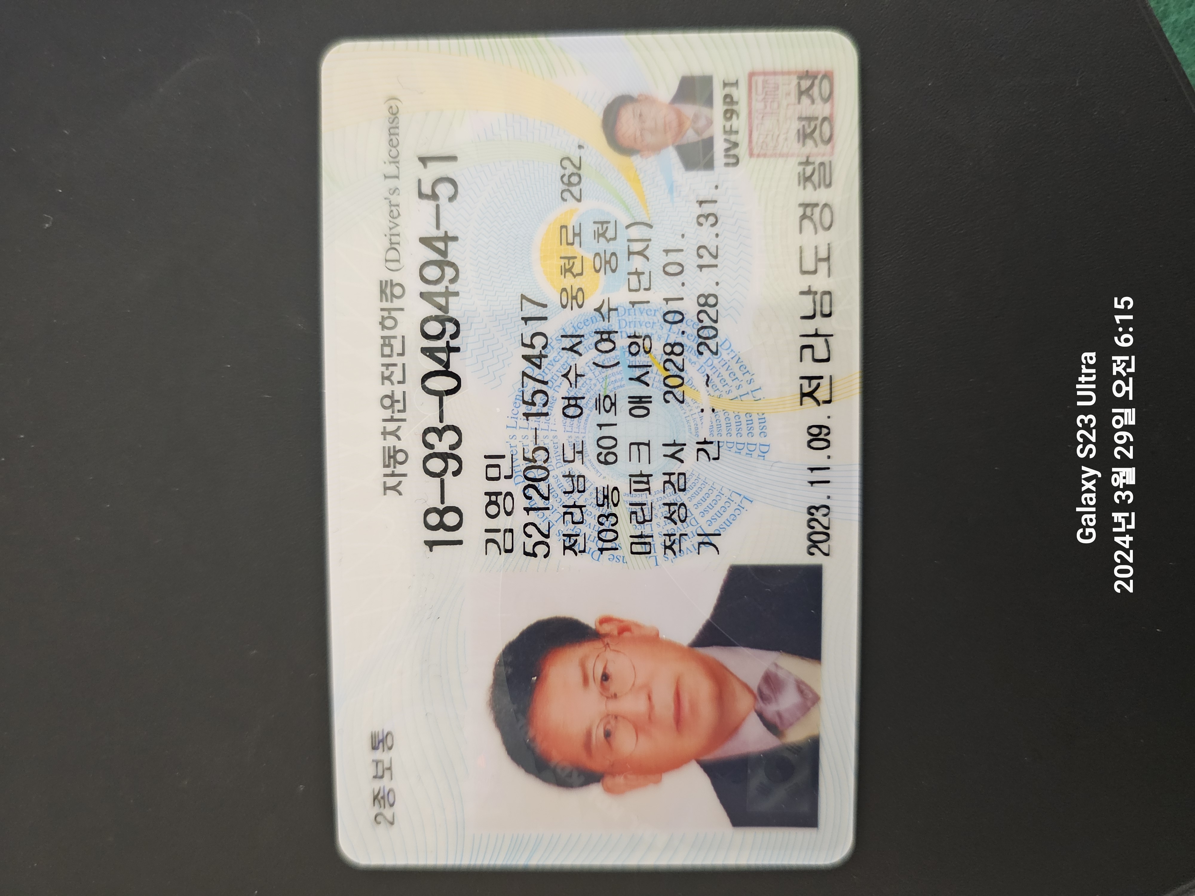 운전면허증2023.11.09전남경찰청발행 18-93-049494-51 유효기간5028.12.31.