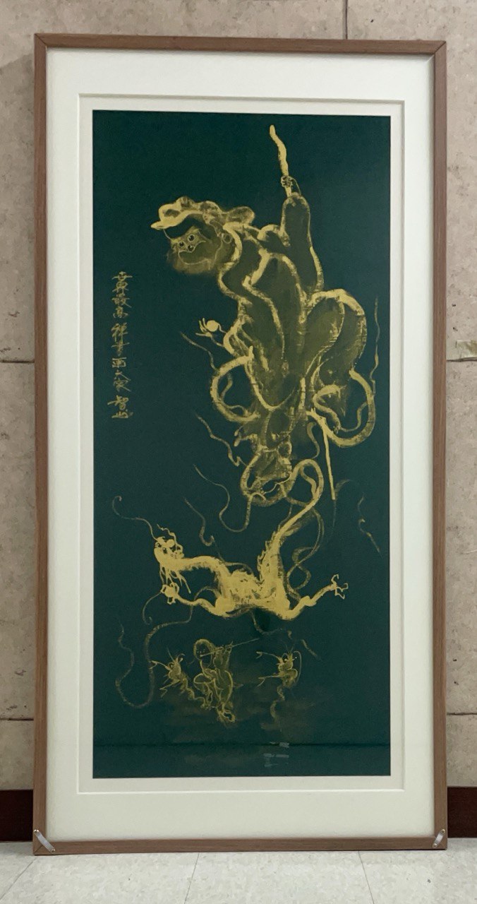 지산 스님의 '갈잎타고 바다를 건너는 달마’는 전통 불교미술의 상징성과 현대적 미감을 결합한 작품이다. 삼베천에 금분을 사용한 재료와 기법이 독특하고, 58x135cm 크기에서 달마의 강렬한 존재감이 느껴져는 것이 특징이다. 금빛 선으로 그려진 달마의 모습은 바람에 흔들리는 갈잎처럼 유연하면서도 바다를 건너는 초월적인 정신을 담아내고 있다. 특히 크게 표현된 눈과 귀는 ‘세상을 넓게 보고 깊이 듣는다’는 깨달음을 상징하면서, 불교 철학의 메시지를 강렬하게 전달한다. 또한 삼베천의 질감과 금분의 조화는 작품에 신성함과 영감을 더하고, 지산 스님의 독창적인 필체가 돋보인다. 이 작품은 전통과 현대가 어우러진 불교미술로, 국제적으로도 한국 불교미술의 매력을 보여주는 좋은 사례라고 볼 수 있다.