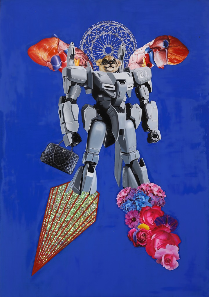 - 작품 속 로봇, 날개를 단 동물(사자 혹은 호랑이), 그리고 화려한 꽃과 같은 오브제들은 초현실적이면서도 상징적입니다.