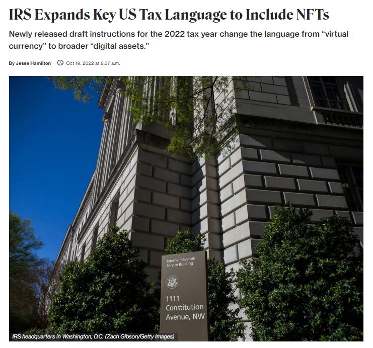 암호화폐 전문 미디어 코인데스크가 "미국 국세청(IRS)이 최근 발표한 2022년 과세연도 지침 초안에서 과세 대상 중 기존 '가상화폐'(virtual currency)를 '디지털 자산'(디지털 자산)으로 변경한다. 새로운 지침은 "디지털 자산은 암호화된 방식으로 분산원장 또는 이와 유사한 기술을 사용해 기록된 모든 디지털 가치를 의미한다"고 규정했다. 이러한 정의에 따르면 암호화폐, 스테이블코인, NFT, 가상화폐는 모두 과세 대상에 포함된다.