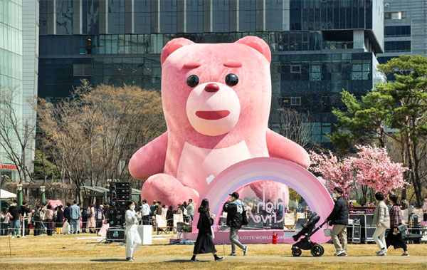 23일 롯데쇼핑에 따르면 경기 의왕에 있는 '롯데프리미엄아울렛 타임빌라스'에서 지난 1일부터 진행돼온 15m 높이 초대형 '벨리곰' 전시가 22일 끝났다. 벨리곰 전시 첫날인 1일 타임빌라스를 방문한 고객은 약 3만5000명으로, 1~4월 주말 평균 방문 고객 수보다 30% 이상 높은 수치를 기록했다.