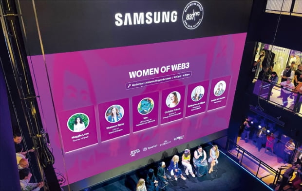 삼성전자 북미법인(삼성US)은 23일(현지시간) 미국 뉴욕의 고객 체험 공간인 삼성837에 패널들을 초청해 이벤트 행사를 열었다. ‘Women of web 3’를 주제로 패널들이 발표하고 있다.